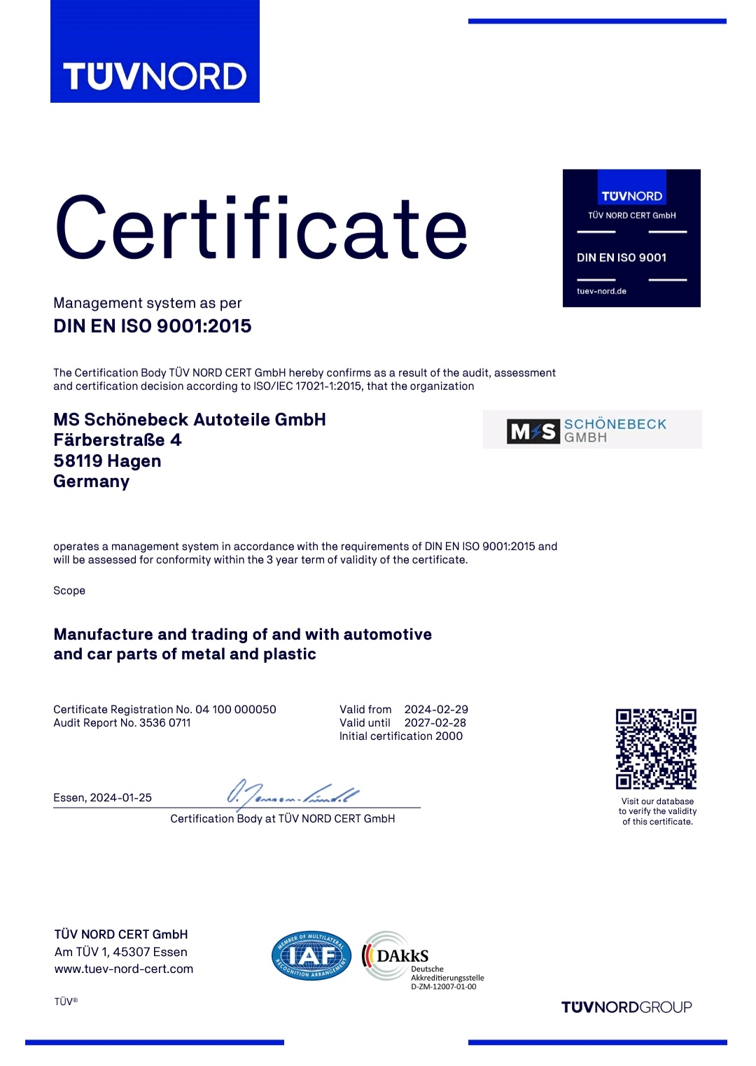 Die MS Schönebeck GmbH ist stolz darauf, nach DIN EN ISO 9001:2015 zertifiziert zu sein. Dieses Zertifikat unterstreicht unser Engagement für höchste Qualität und Effizienz in all unseren Prozessen. Es garantiert unseren Kunden zuverlässige, präzise und termingerechte Lieferungen, die stets den höchsten Standards entsprechen.